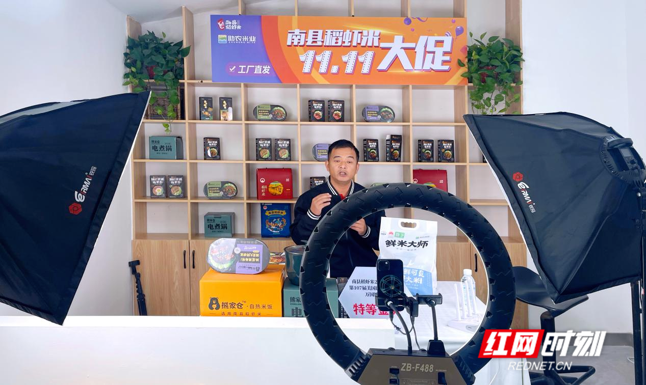 ▲主播线上直播带货南县稻虾米。