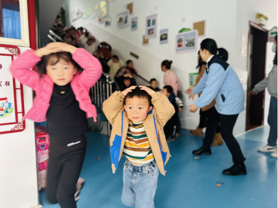 演练前, 各班老师根据幼儿年龄特点,通过视频、图片等方式开展班级主题教育,引导幼儿了解地震自然灾害, 并向幼儿讲解、示范地震时的自救方式, 学会应急避震的正确方法。随着一声警报的响起, 班级老师立即告知幼儿“地震来了”老师各司其职,组织幼儿迅速弯腰护头, 有序沿着指定疏散路线撤离,确保每名幼儿的安全。到达安全地点后,各班老师引导幼儿立即原地蹲下,双手护头。教师及时清点并上报班级人数,确保所有师幼都安全撤离到空旷位置。