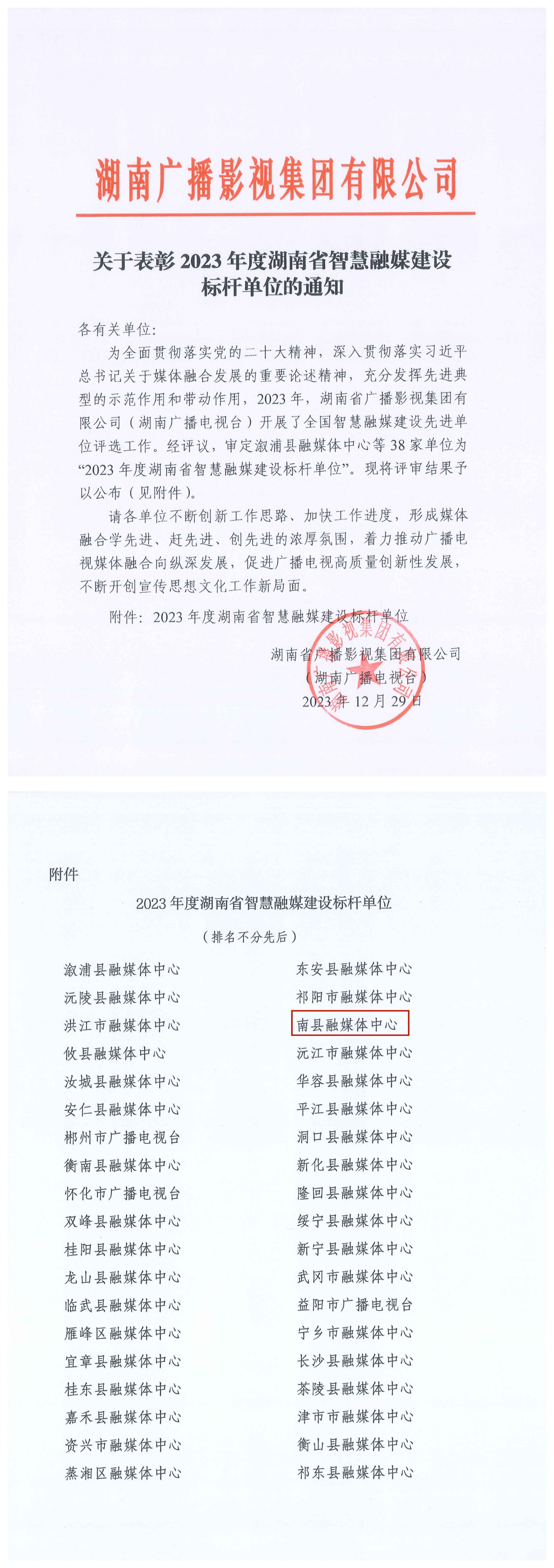 日前,湖南省广播影视集团有限公司(湖南广播电视台)公布2023年度湖南省智慧融媒建设标杆单位的考评结果,38家融媒体中心上榜,南县融媒体中心榜上有名!
