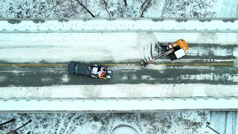 在南安大桥上,一台融雪剂撒布车和一台铲雪车正相互配合进行撒盐除冰作业。南县融媒体中心供图