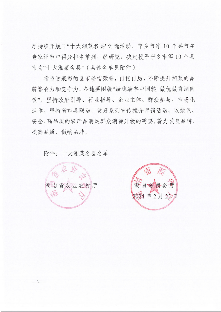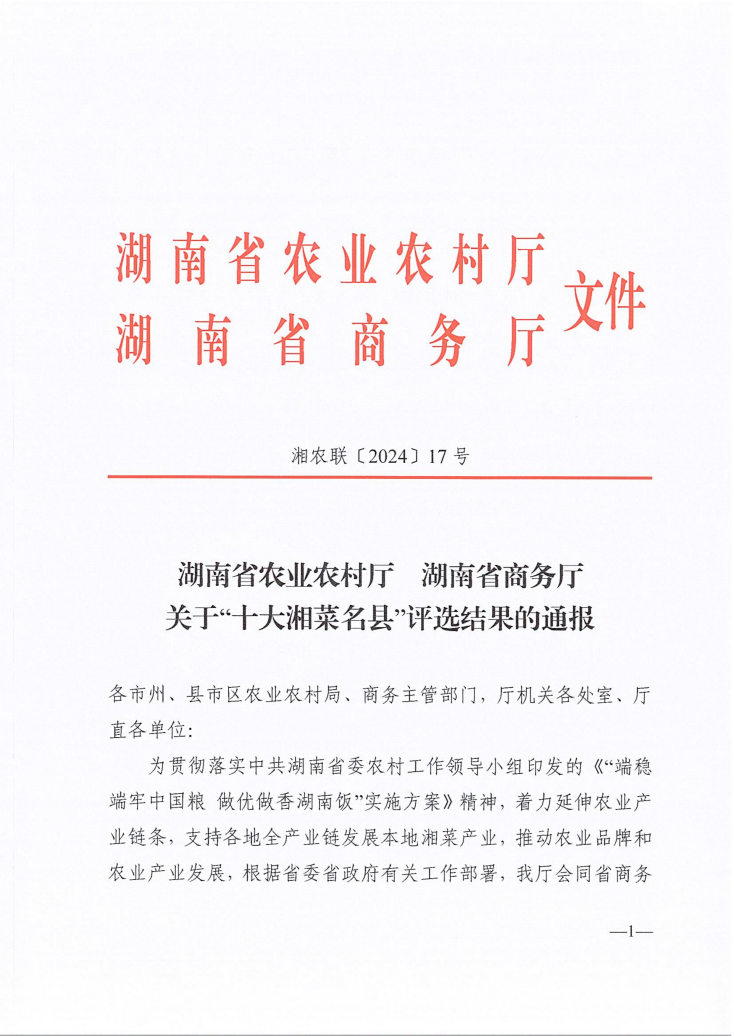 “端稳端牢中国粮,做优做香湖南饭”。为支持各地全产业链发展本地湘菜产业,推动农业品牌和农业产业发展,湖南省农业农村厅和省商务厅开展了“十大湘菜名县”评选活动,并于日前公布了入选名单,南县名列其中。
