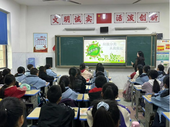 教室里,班主任化身为垃圾分类讲解员,通过图片、视频等形式绘声绘色地讲授垃圾分类的现状、垃圾分类的重要性,让学生切身体会如何进行垃圾分类,以及如何将垃圾分类的知识运用到生活当中,并鼓励孩子们积极参与到垃圾分类行动中,做好垃圾分类的“宣传员”和“实践者”。