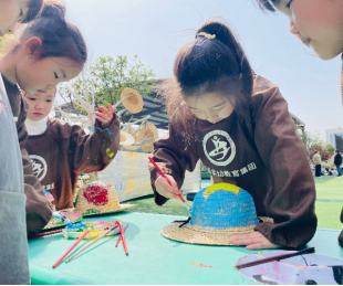活动当天,小朋友顶着草帽高高兴兴来到涂鸦区,迫不及待地创作起来。他们拿起小刷子,蘸取相应的颜料,任由想象力驰骋于画笔之下,很快,一顶顶个性十足的草帽就在孩子们手中诞生了。孩子们戴上自己亲手创作的花草帽,脸上露出灿烂的笑容。