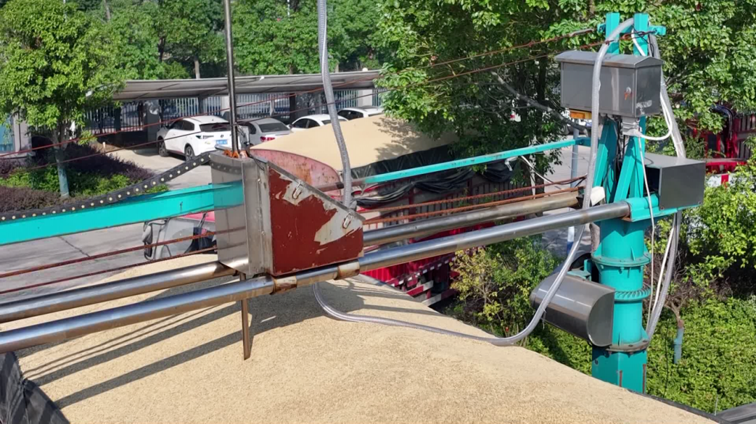 走进储备中心收购现场,满载金黄色稻谷的运粮车辆沿引导线有序排队,电子屏实时滚动粮食收储信息,经过全自动检测仪,收运的稻谷在30秒内可完成水分初检,数据同步上传至系统,全程“零人工干预”,杜绝误差。检验完成后,稻谷经传送带输送至清理筛,分离出秸秆、碎石等杂质后,干净的稻谷则被暂存至立筒仓。