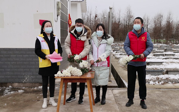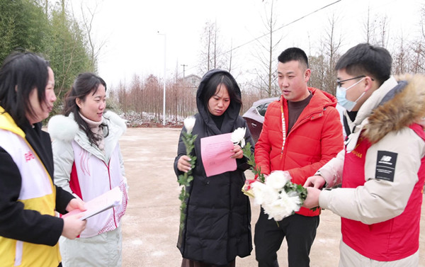 1月15日,在明山头镇耕余堂村公墓“鲜花换纸钱”临时服务点,志愿者手持花束,向前来祭祀的村民们宣传文明祭祀理念,用鲜花换取村民们手中的烧纸,用电子鞭炮代替传统烟花爆竹。同时,志愿者还挨家挨户向村民和商户发放《文明祭祀倡议书》《云上缅怀小程序使用手册》,向居民宣传文明祭祀理念,倡导低碳祭扫方式。