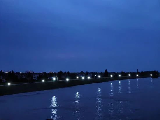 夜幕降临,浪拔湖镇防汛大堤全线灯火通明。