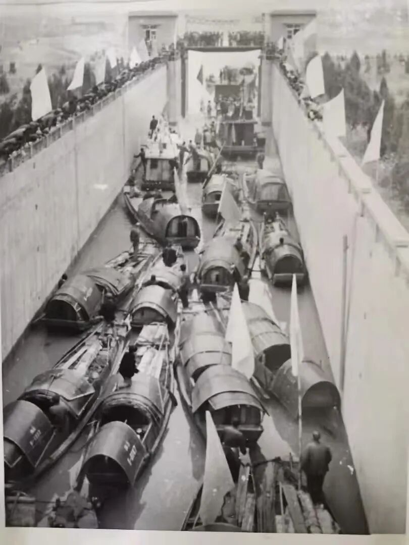 闸门开了(操作员工用廊道门放平了内外河的水),上班了,满艄公乘陈半仙的船进了闸室,后面的船只跟进,秩序井然。