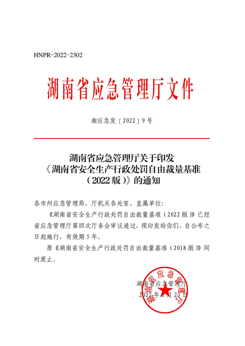 湖南省应急管理厅关于印发《湖南省安全生产行政处罚自由裁量基准(2022版)》的通知(1)