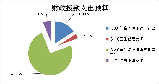 按支出科目包括:自然资源海洋气象等支出316.5万元,占74.52%;社会保障和就业支出68.18万元,占16.05%;卫生健康支出13.87万元,占3.27%;住房保障支出26.15万元,占6.16%。