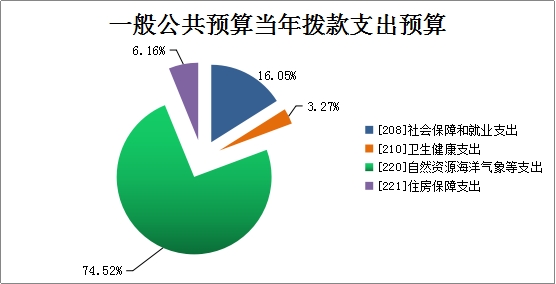 自然资源海洋气象等支出316.5万元,占比74.52%;社会保障和就业支出68.18万元,占比16.05%;卫生健康支出13.87万元,占比3.27%;住房保障支出26.15万元,占比6.16%。