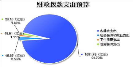 农林水支出1691.78元,占94.70%;社会保障和就业支出45.67万元,占2.56%;卫生健康支出19.91万元,占1.11%;住房保障支出29.16万元,占1.63%。