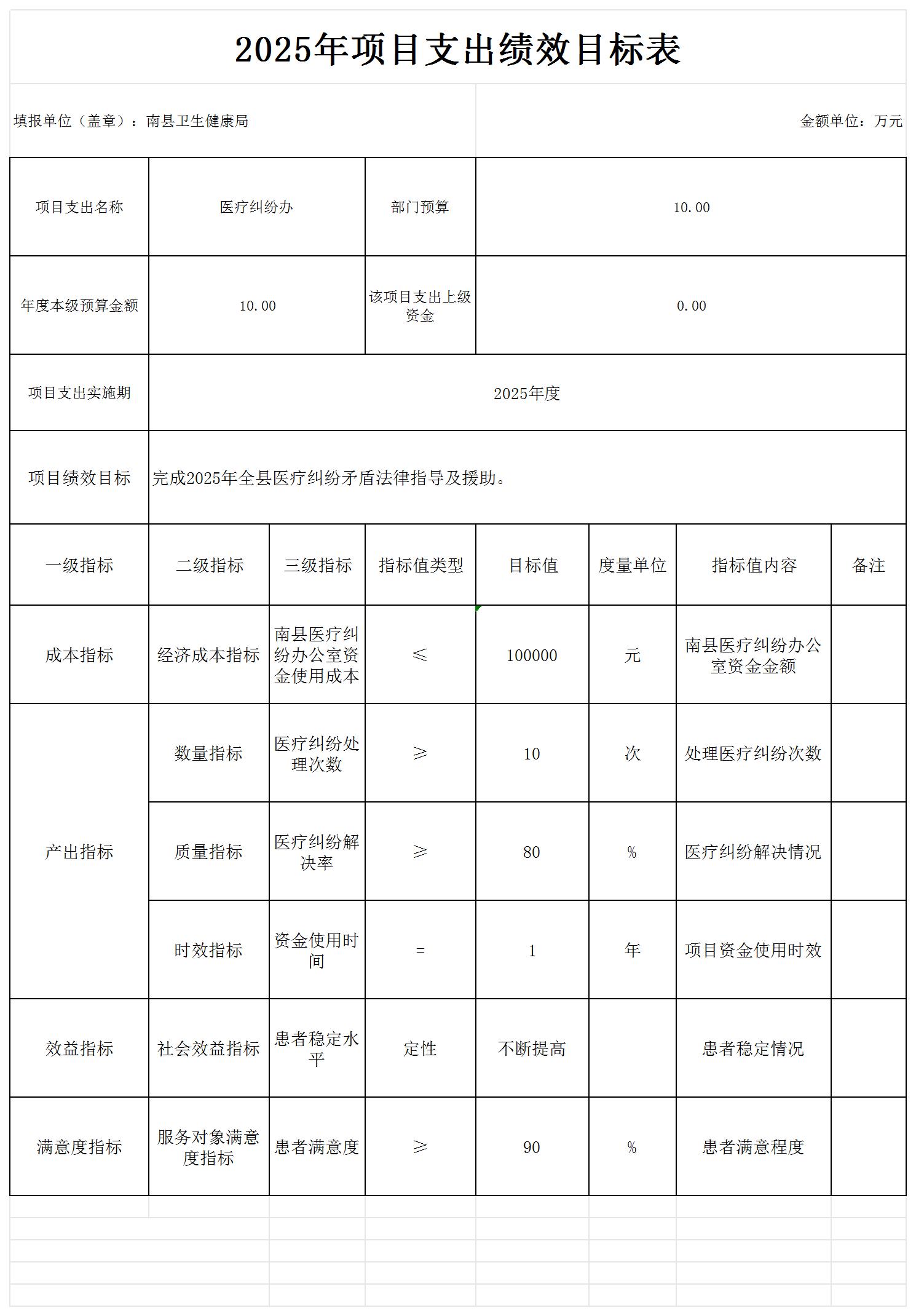 南县卫生健康局2025年项目支出绩效目标表