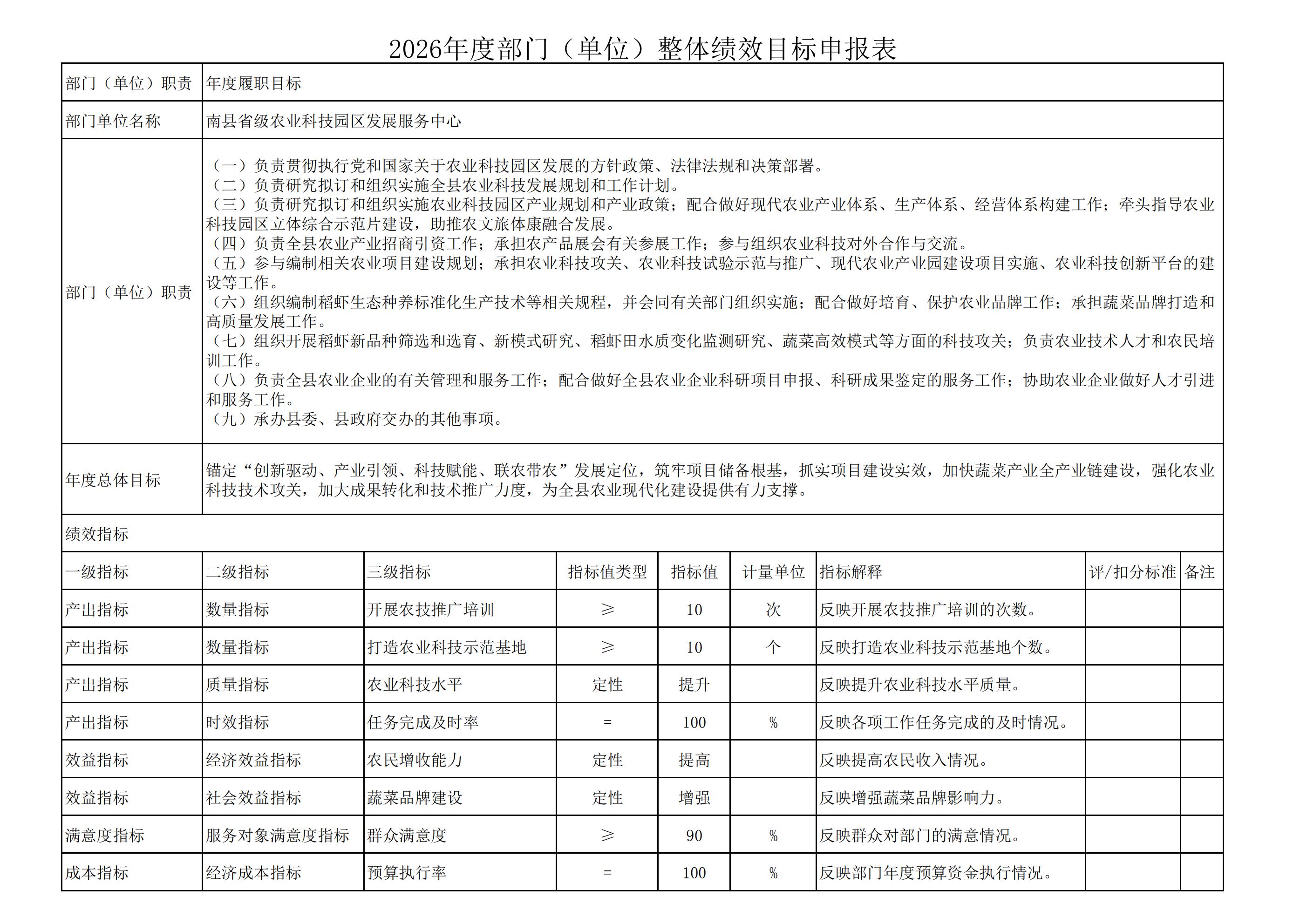 2026年度南县省级农业科技园区发展服务中心整体绩效目标申报表