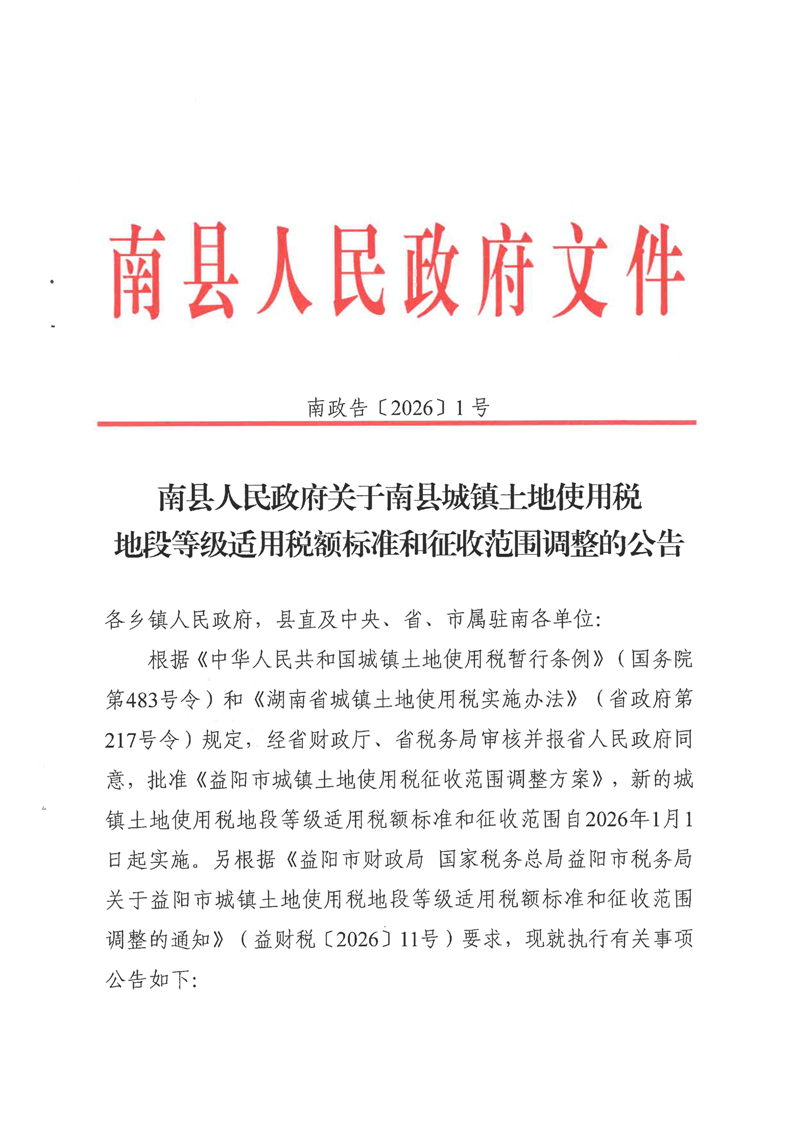 关于南县城镇土地使用税地段等级适用税额标准和征收范围调整的公告