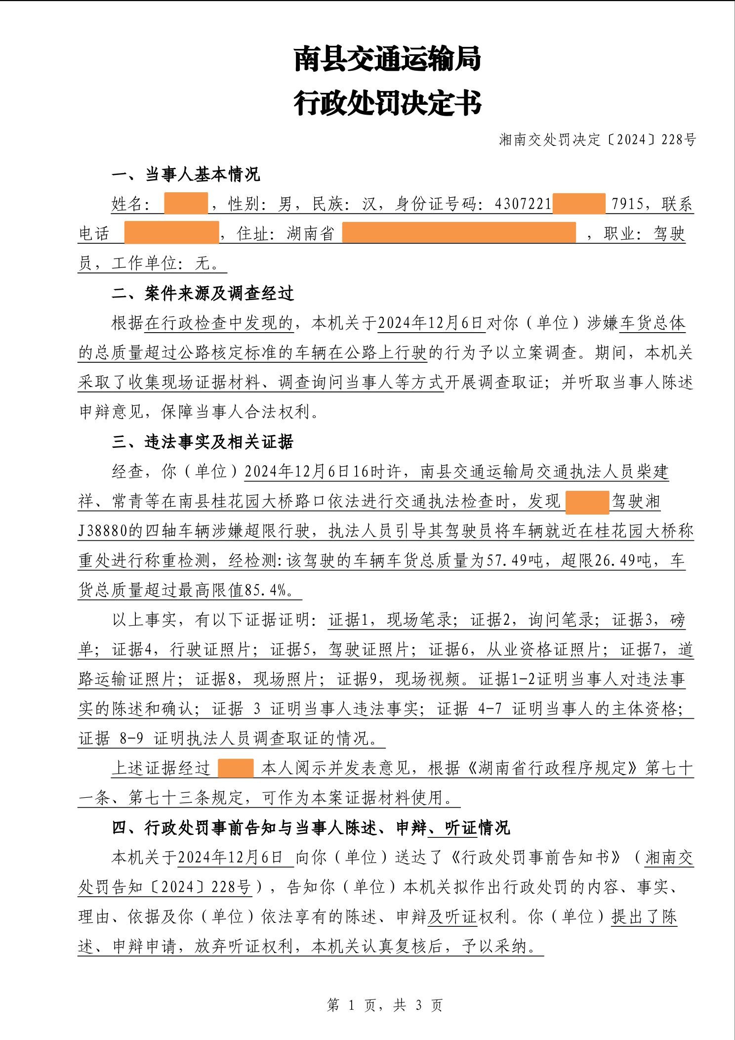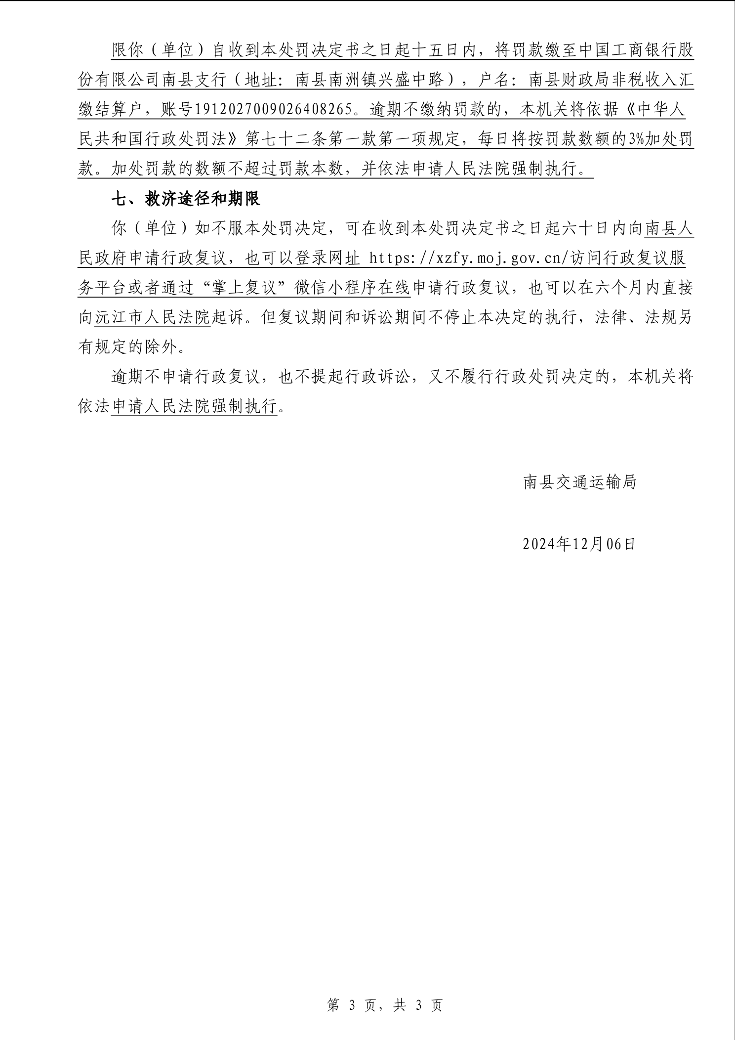南县交通运输局行政处罚决定书湘南交处罚决定〔2024〕228号