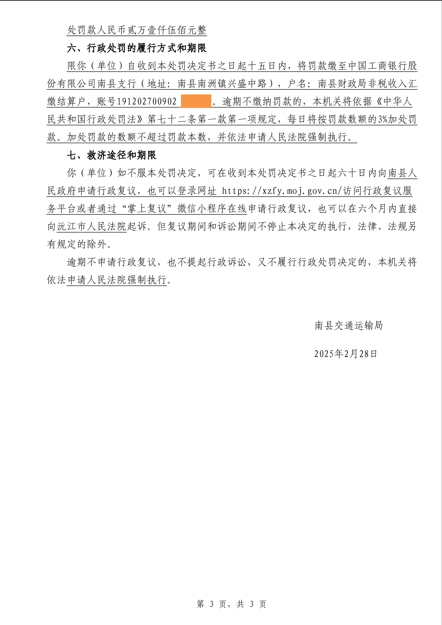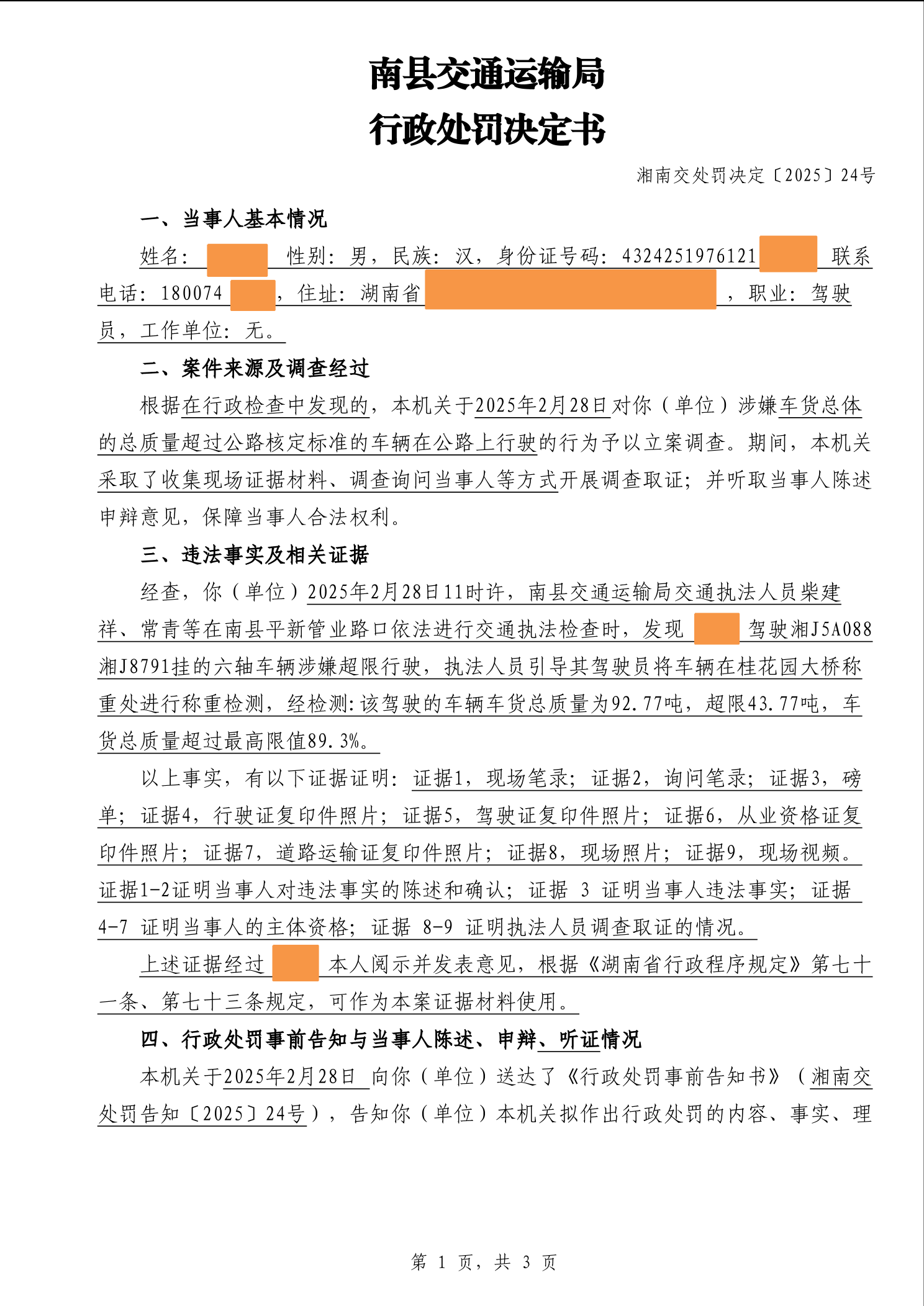 南县交通运输局行政处罚决定书湘南交处罚决定〔2025〕24号