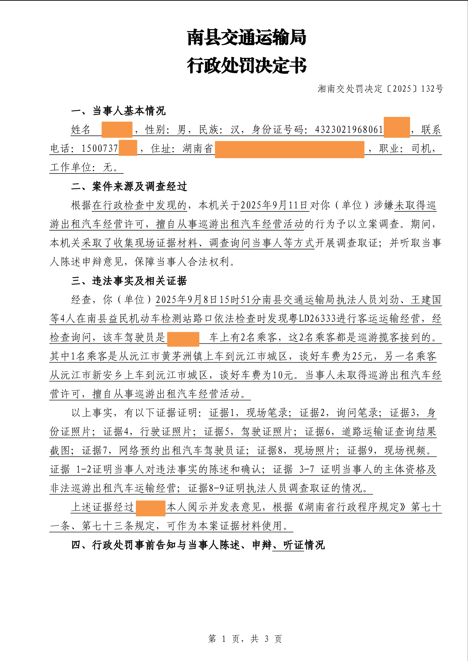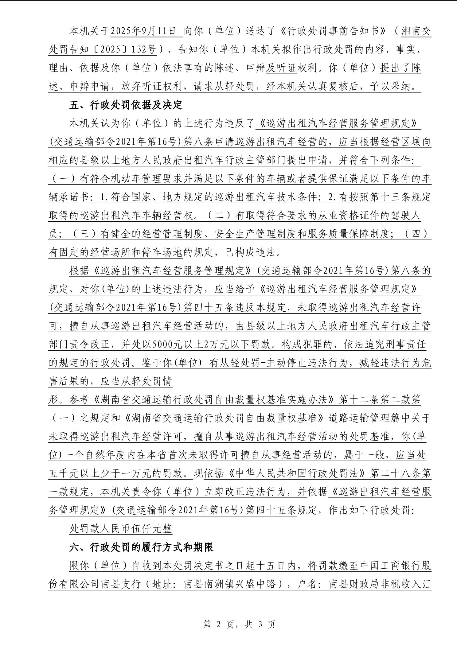 南县交通运输局行政处罚决定书湘南交处罚决定〔2025〕132号