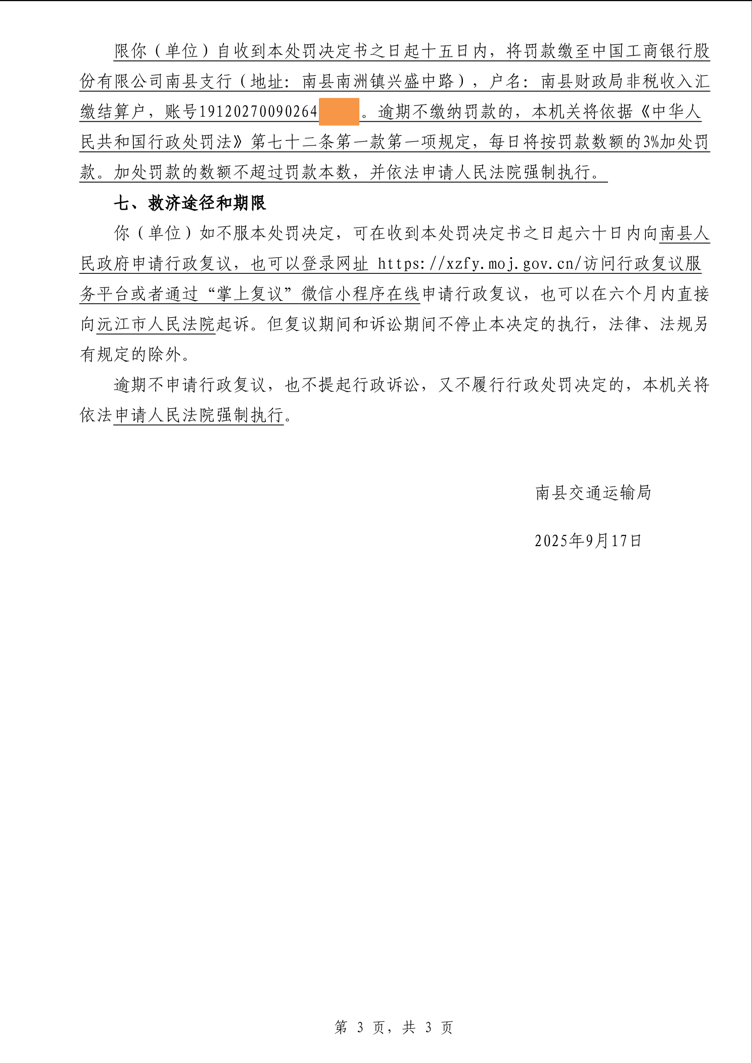 南县交通运输局行政处罚决定书湘南交处罚决定〔2025〕134号