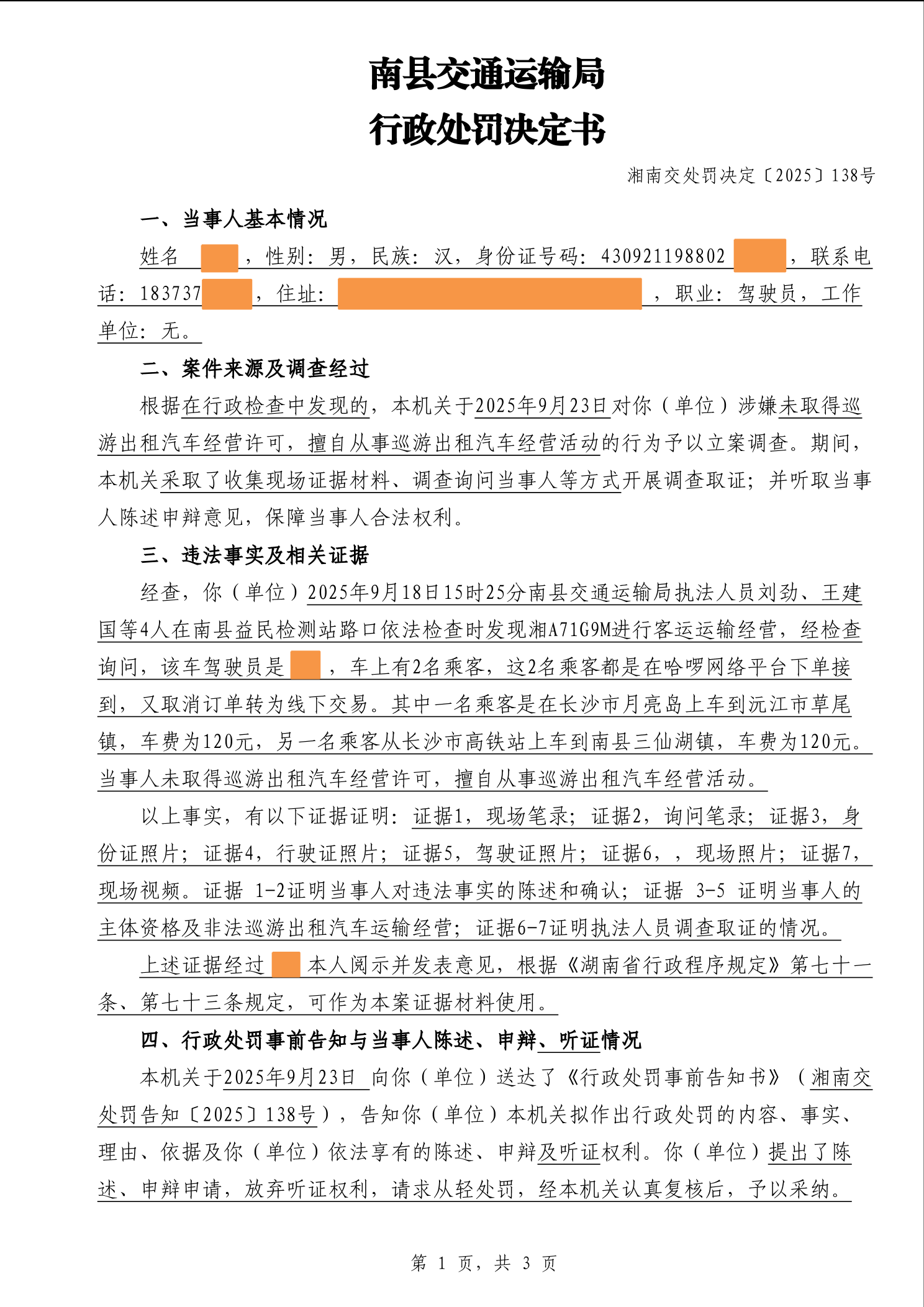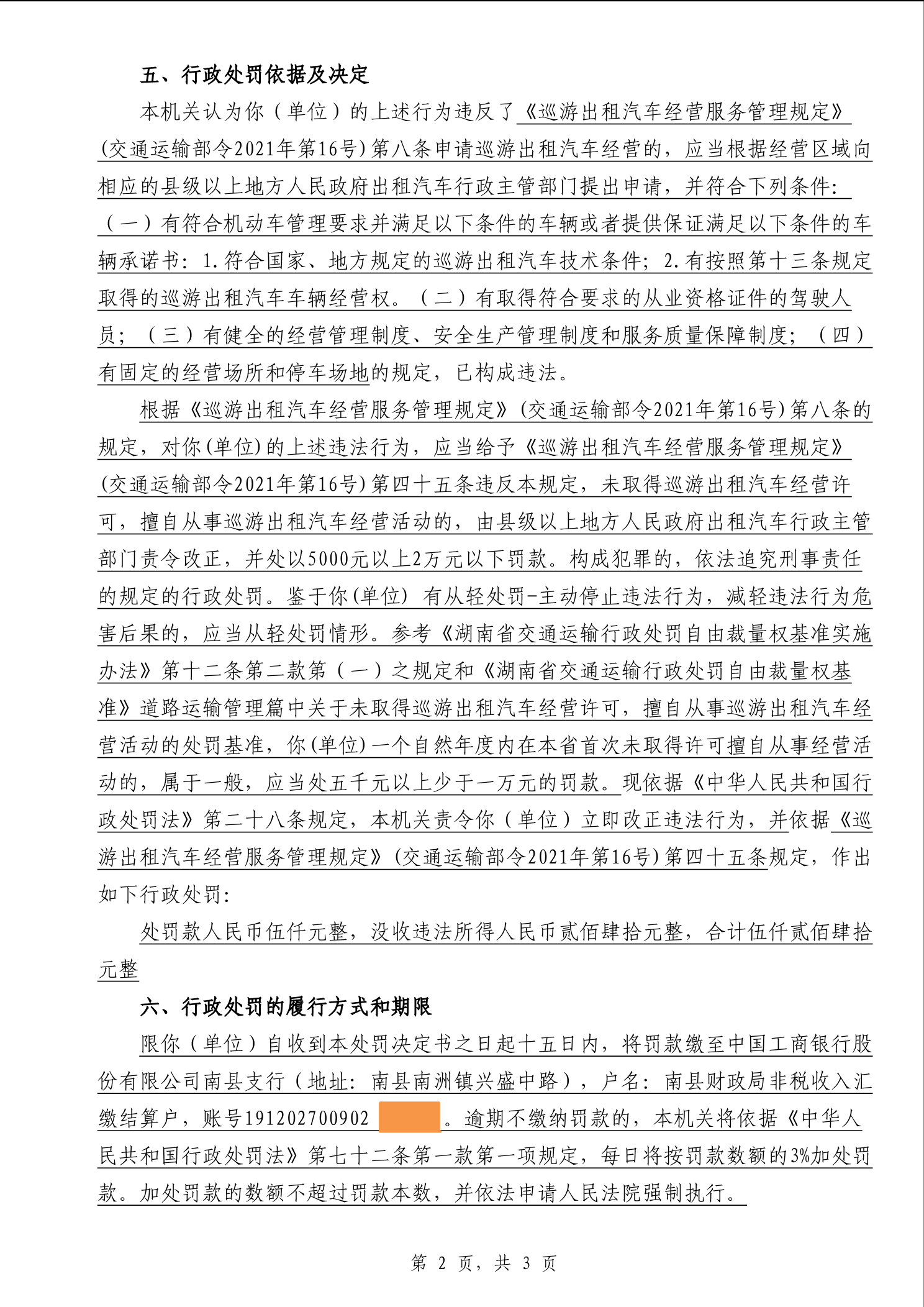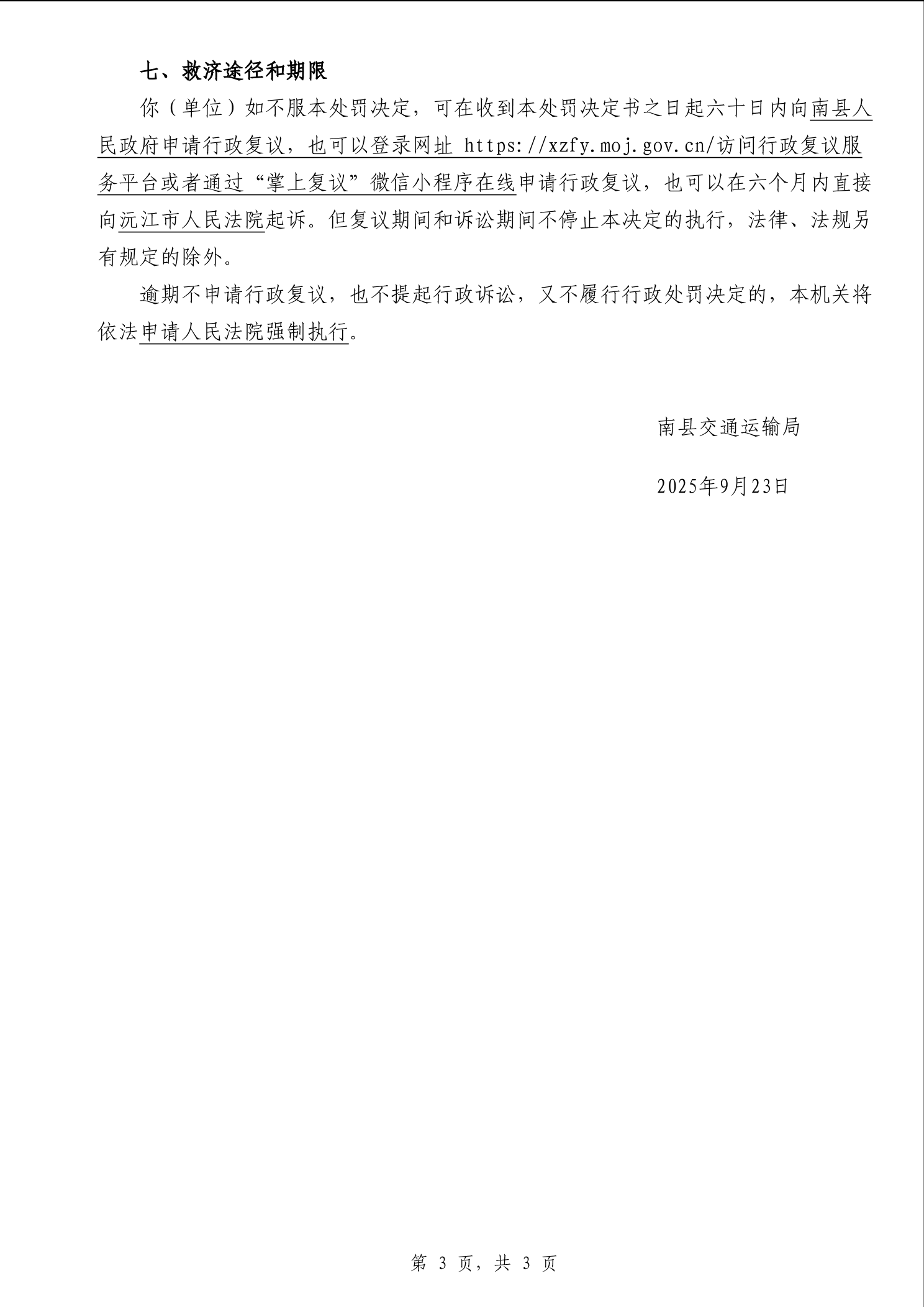 南县交通运输局行政处罚决定书湘南交处罚决定〔2025〕138号
