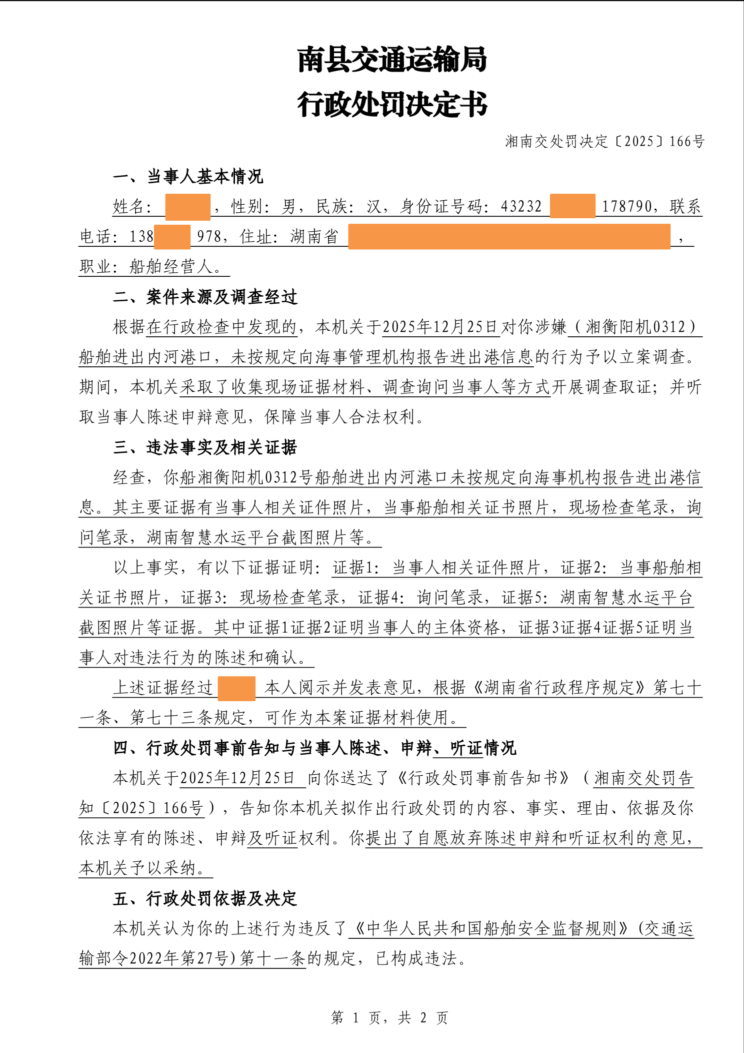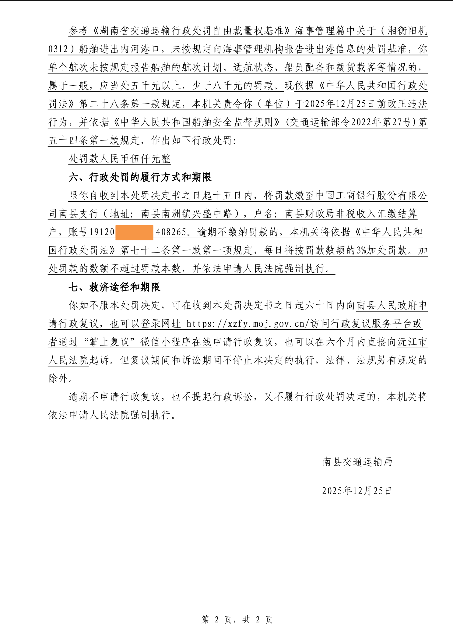 南县交通运输局行政处罚决定书湘南交处罚决定〔2025〕166号