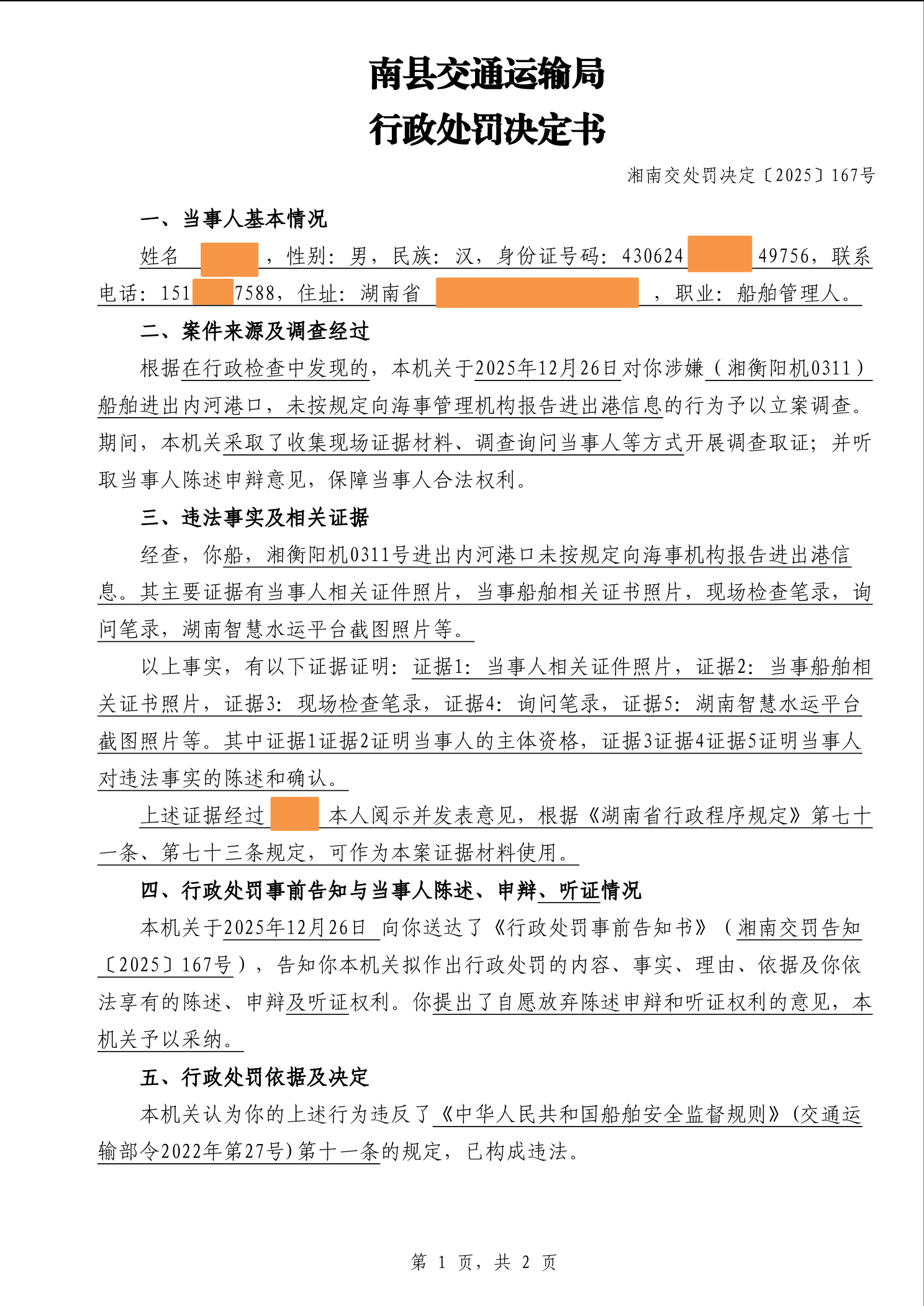 南县交通运输局行政处罚决定书湘南交处罚决定〔2025〕167号