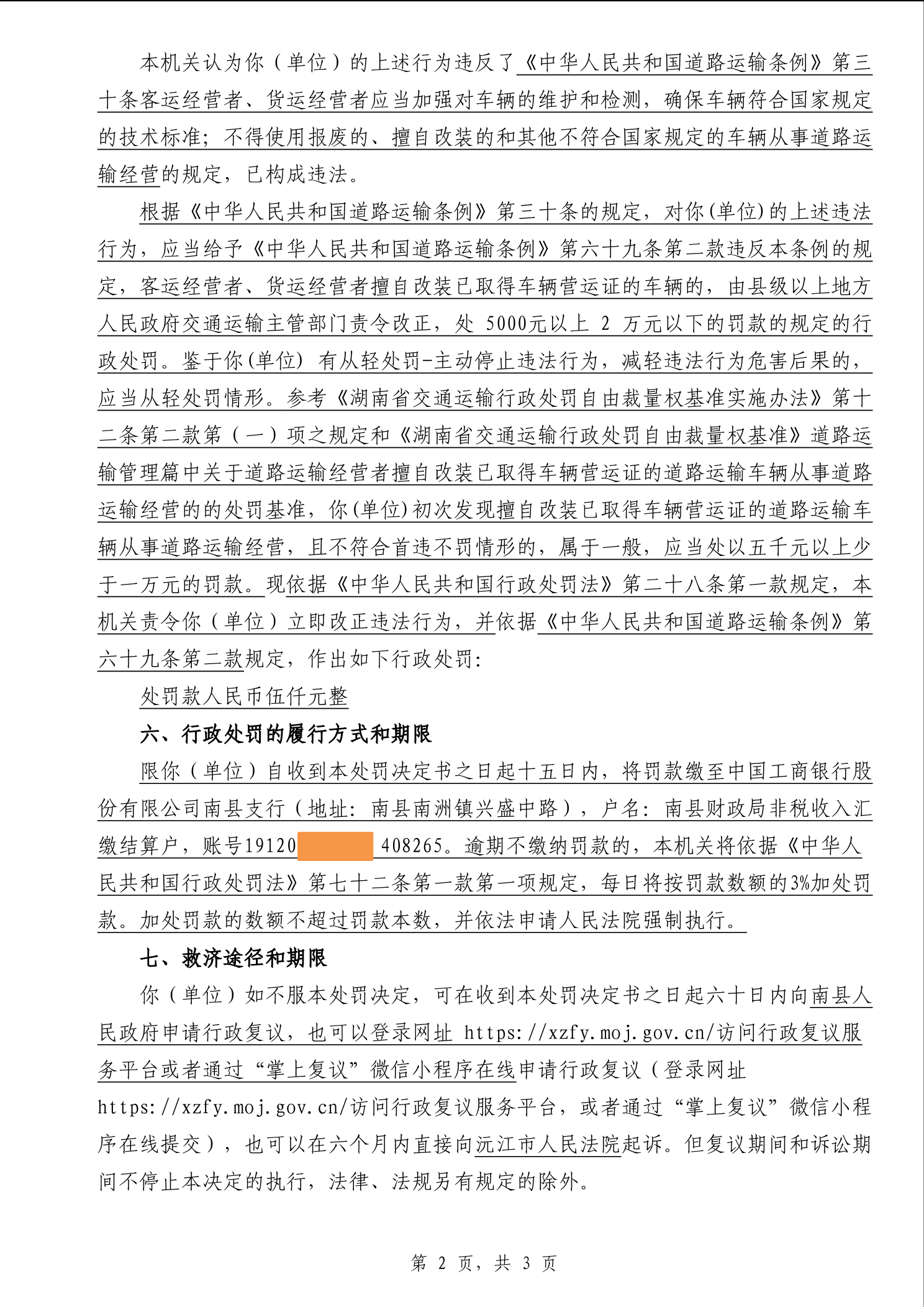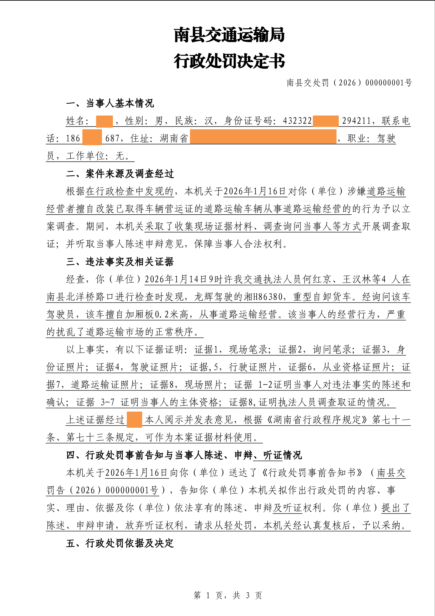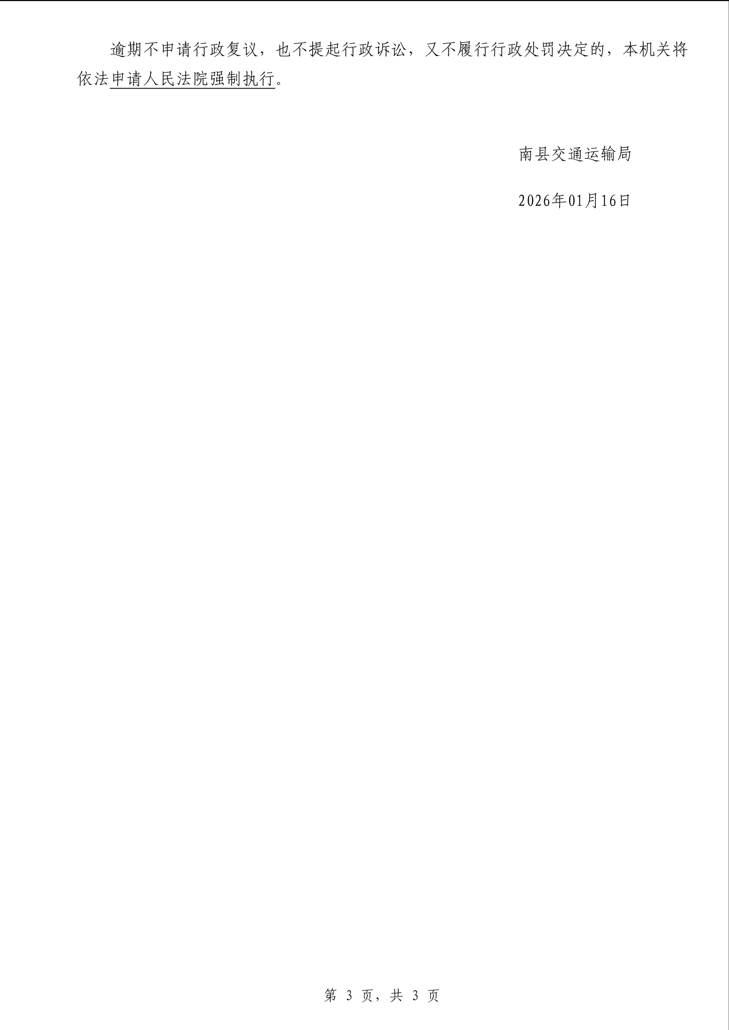 南县交通运输局行政处罚决定书南县交处罚(2026)000000001号