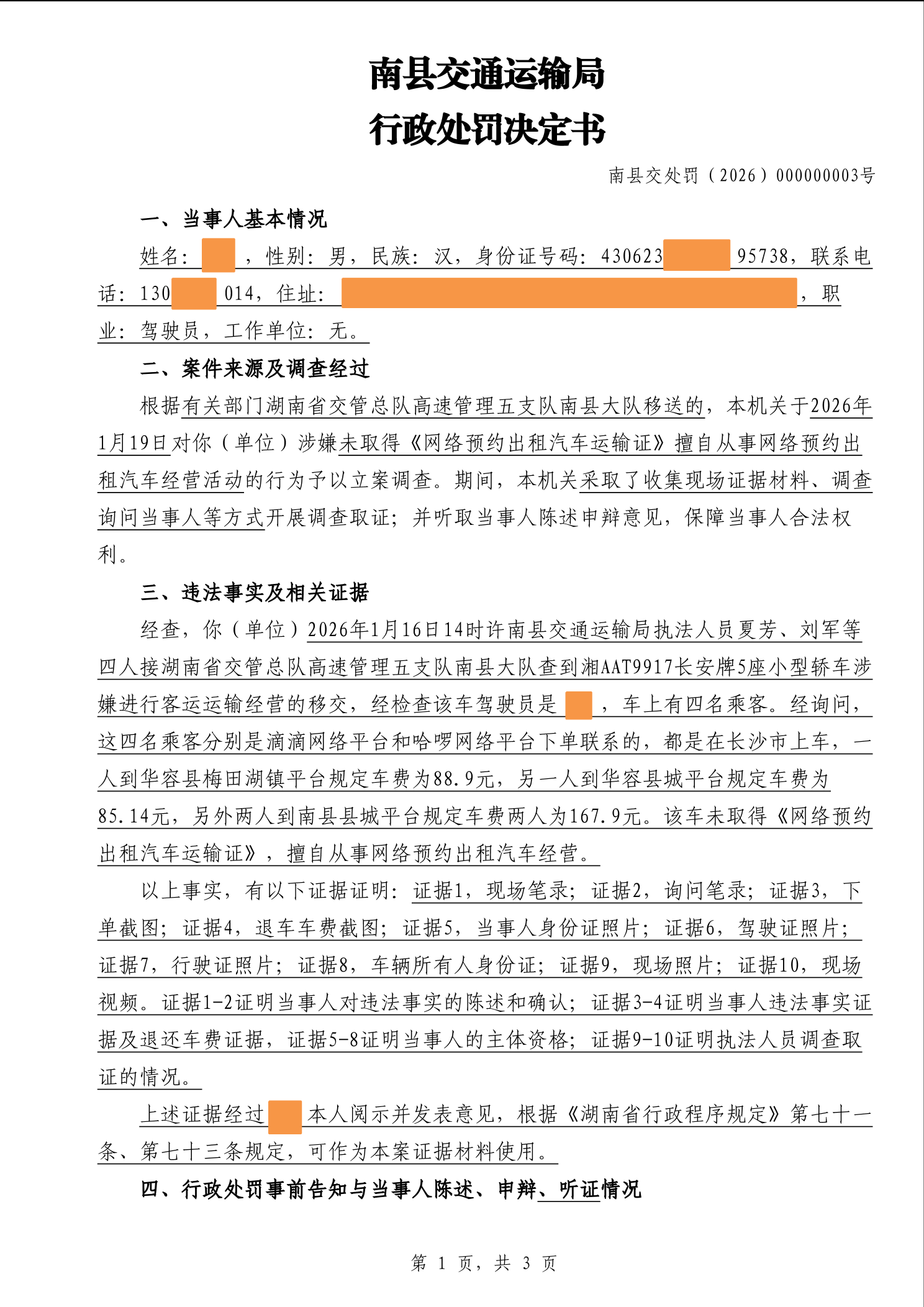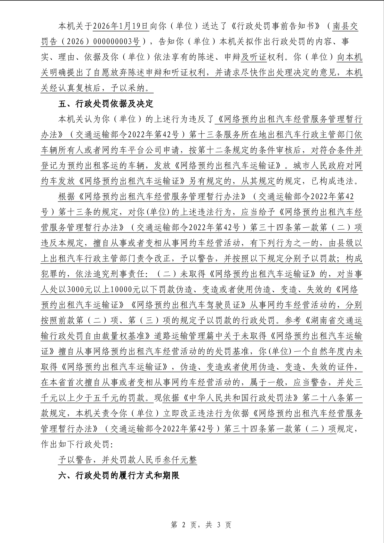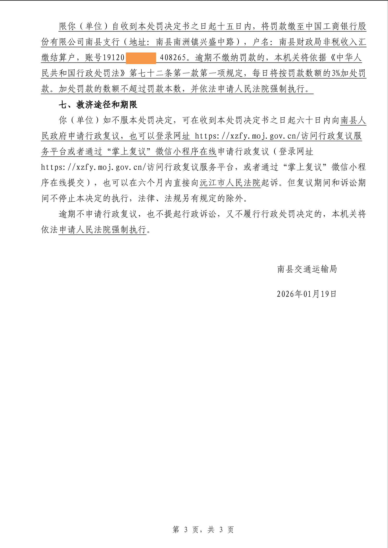 南县交通运输局行政处罚决定书南县交处罚(2026)000000003号