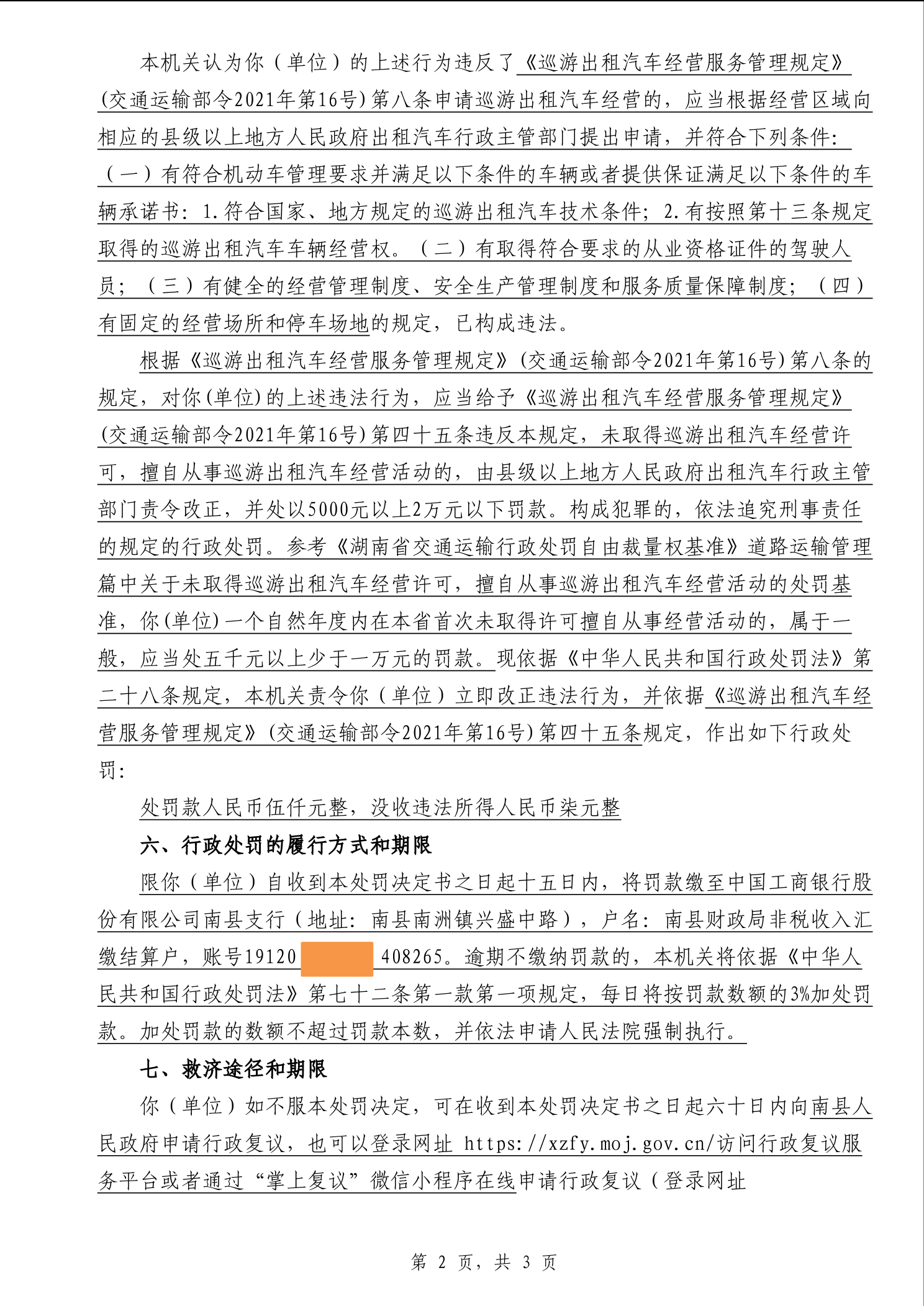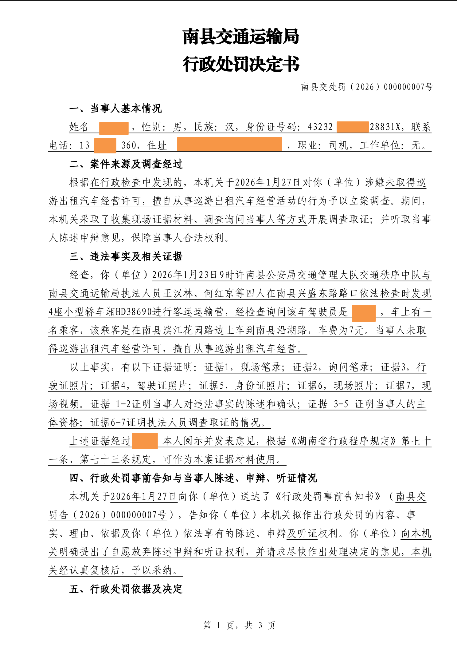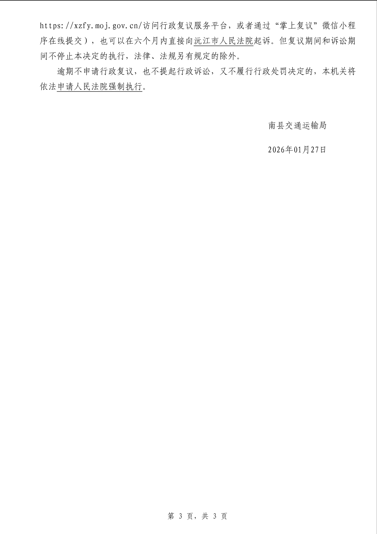 南县交通运输局行政处罚决定书南县交处罚(2026)000000007号