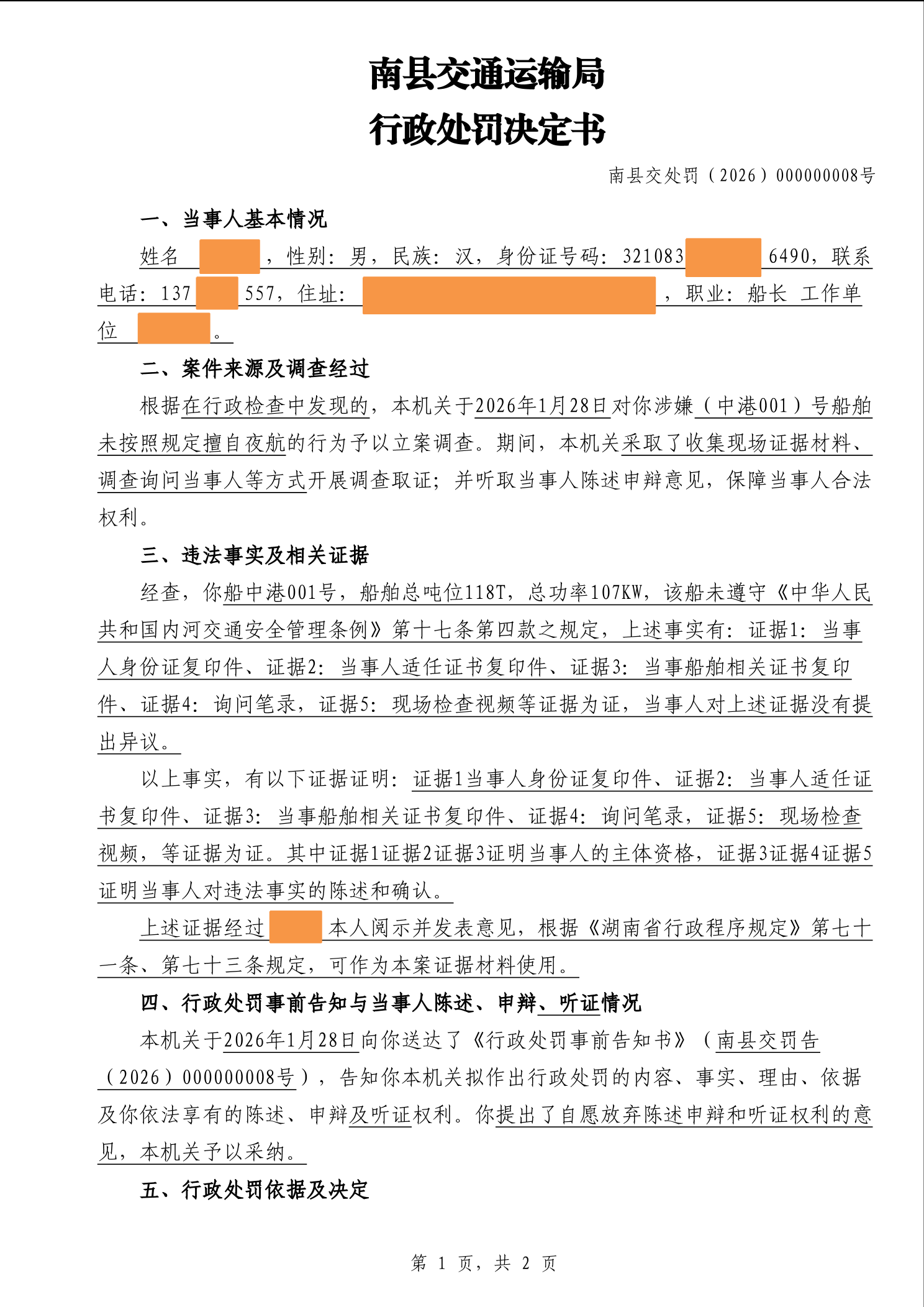 南县交通运输局行政处罚决定书南县交处罚(2026)000000008号