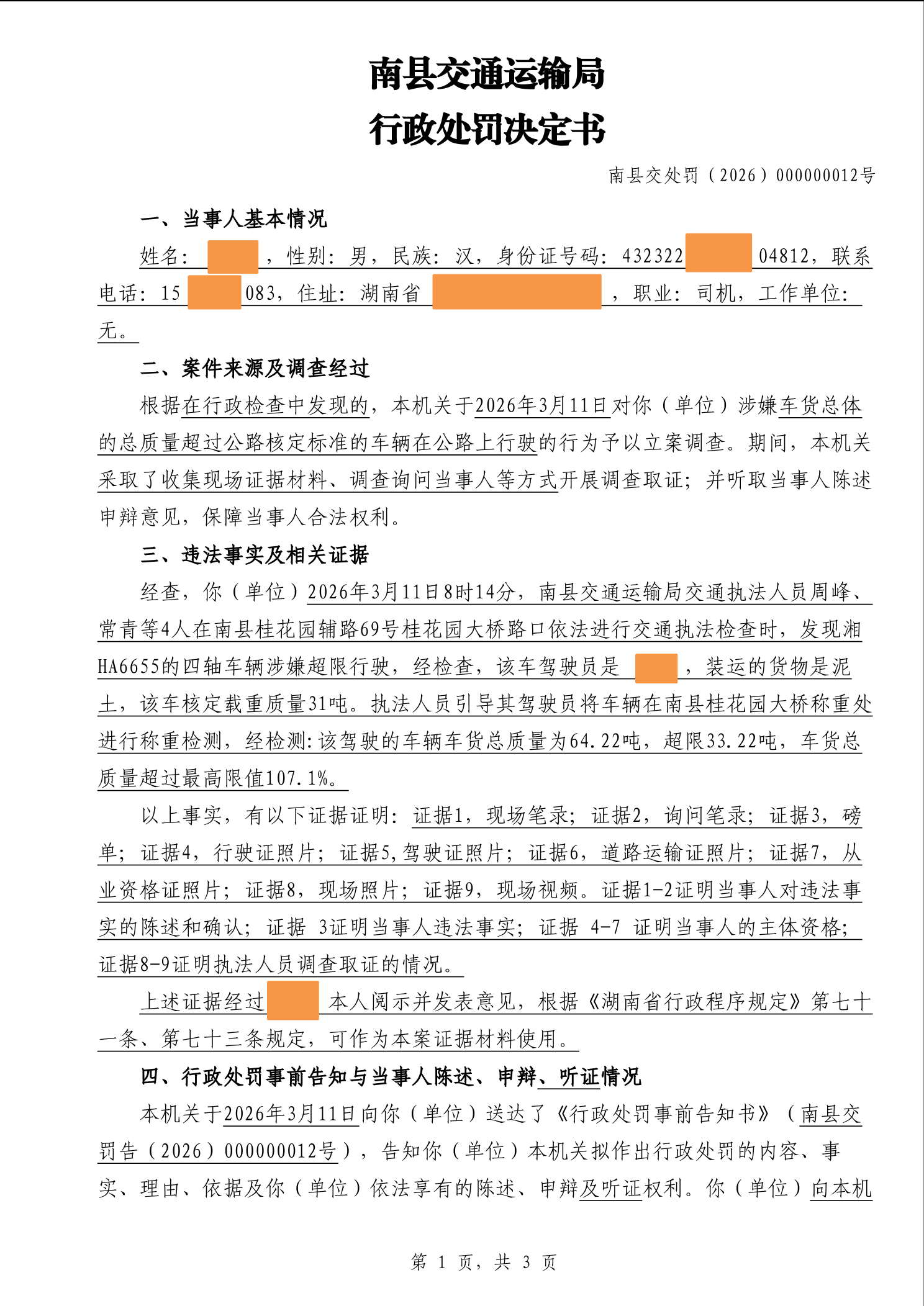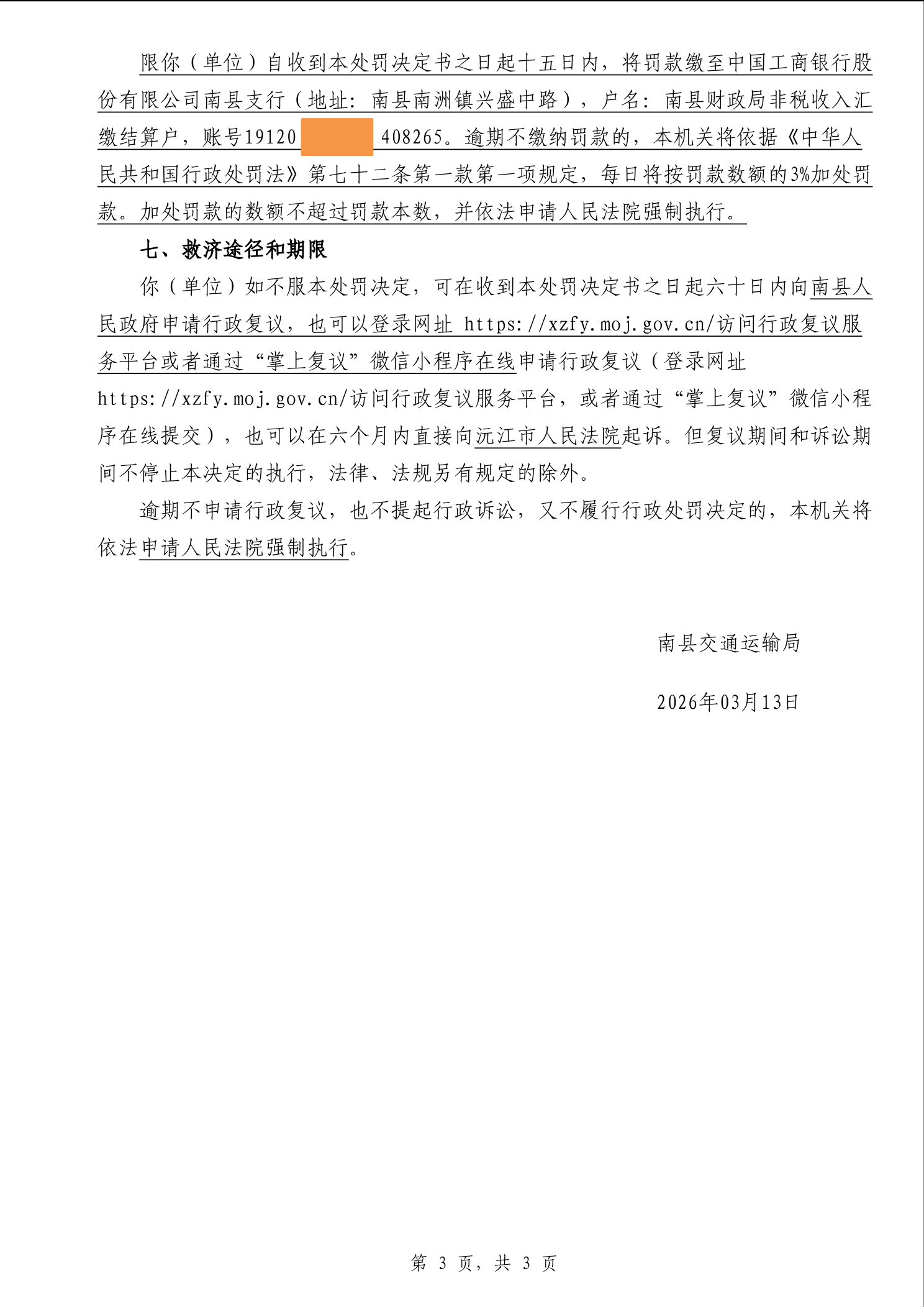 南县交通运输局行政处罚决定书南县交处罚(2026)000000012号