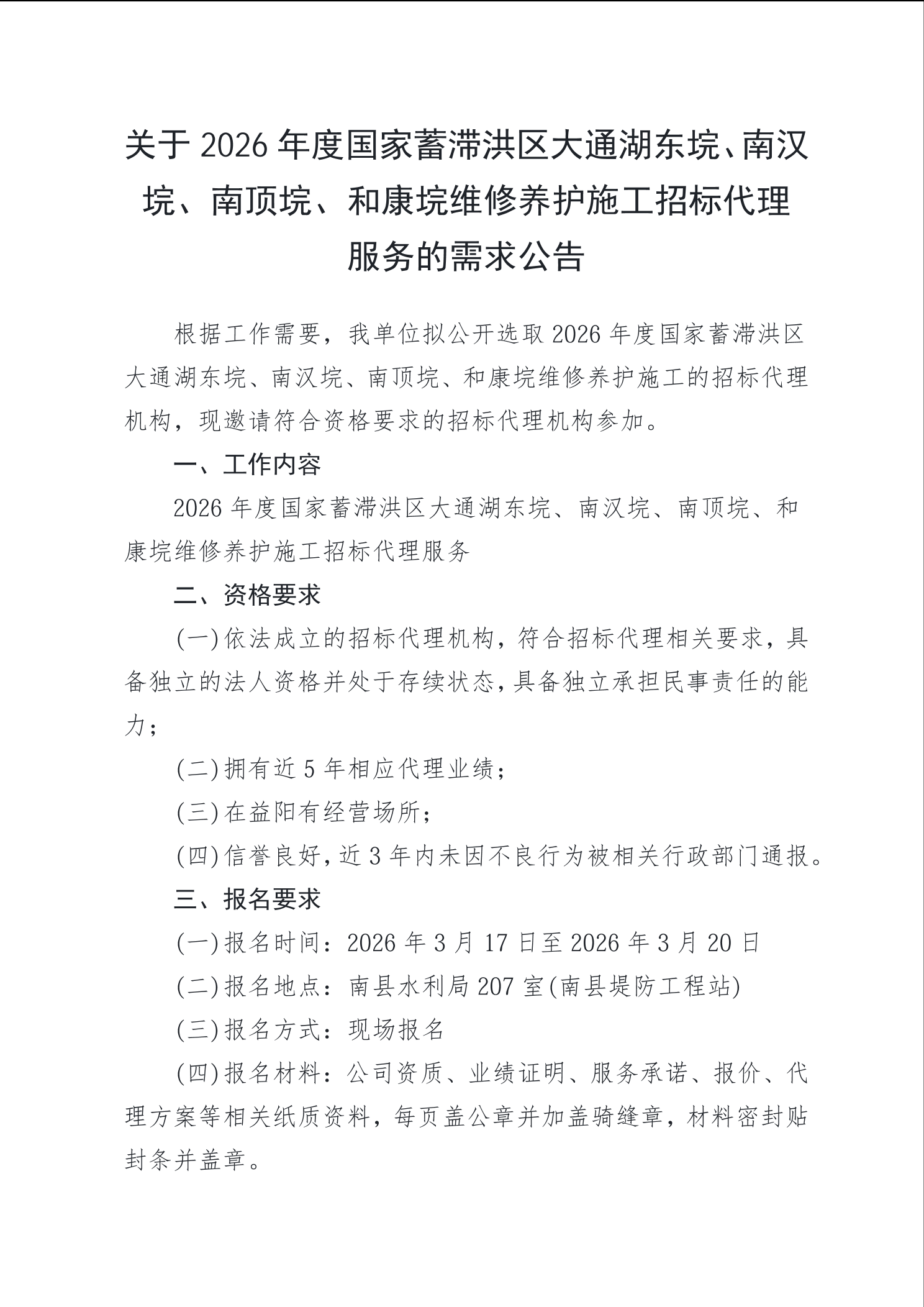 关于2026年度国家蓄滞洪区大通湖东垸、南汉垸、南顶垸、和康垸维修养护施工招标代理服务的需求公告