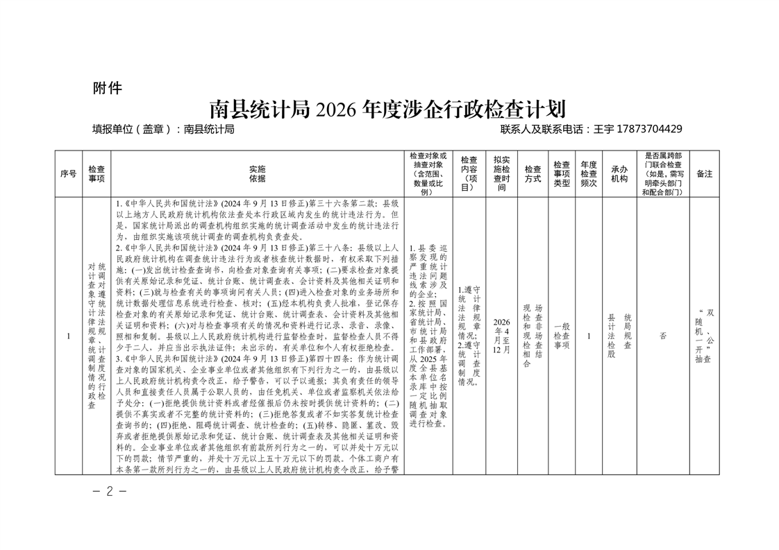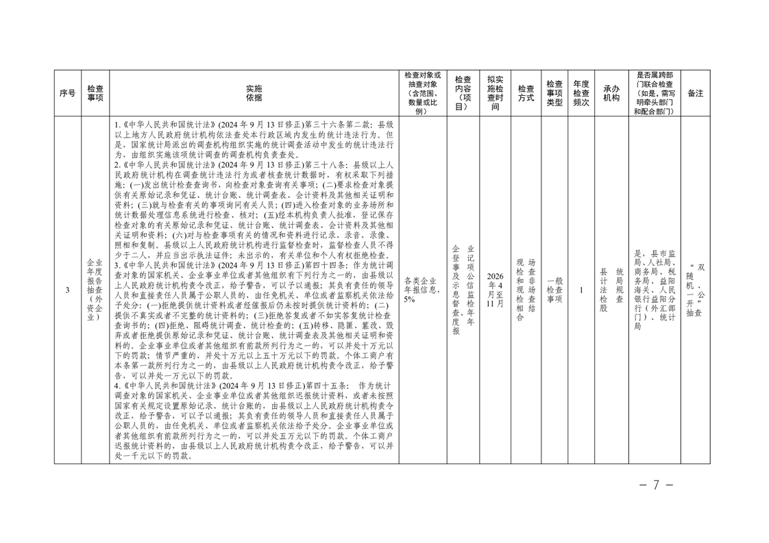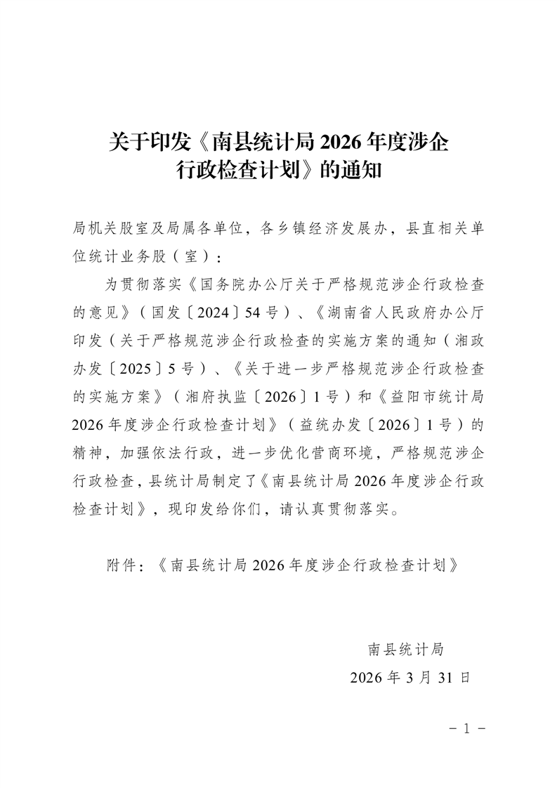 关于印发《南县统计局2026年度涉企行政检查计划》的通知