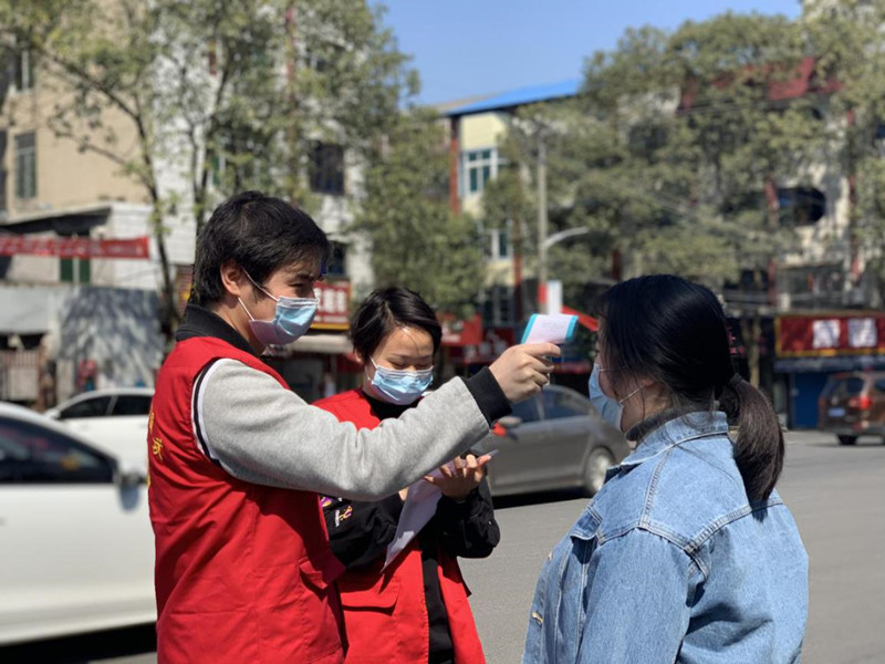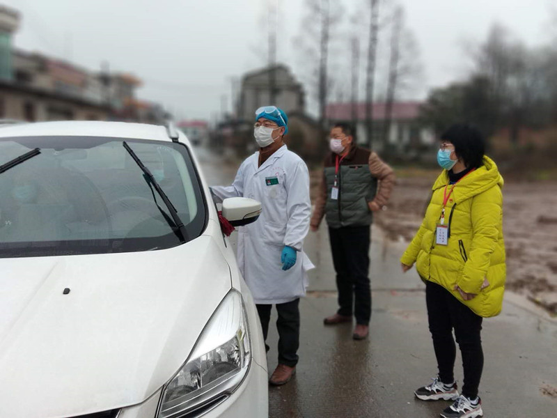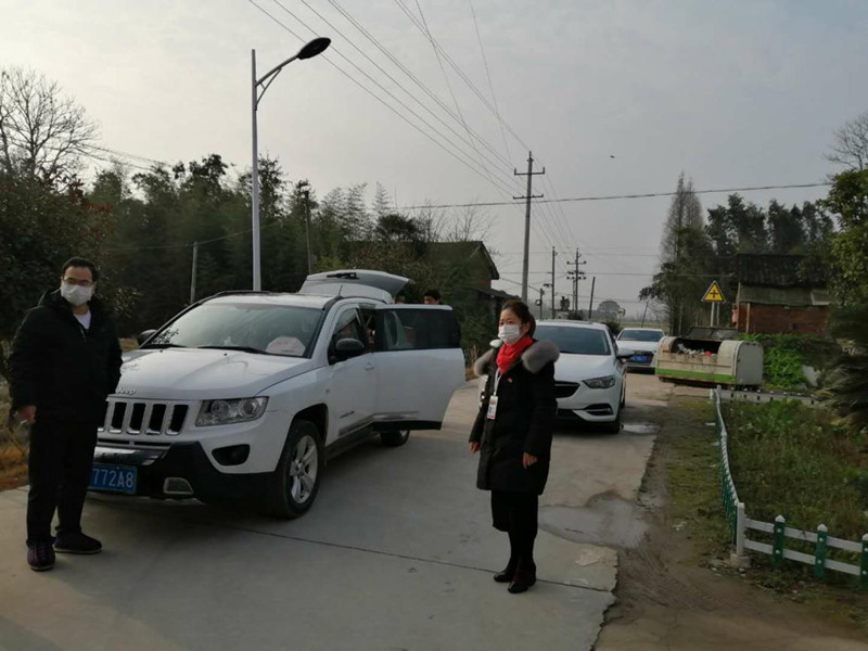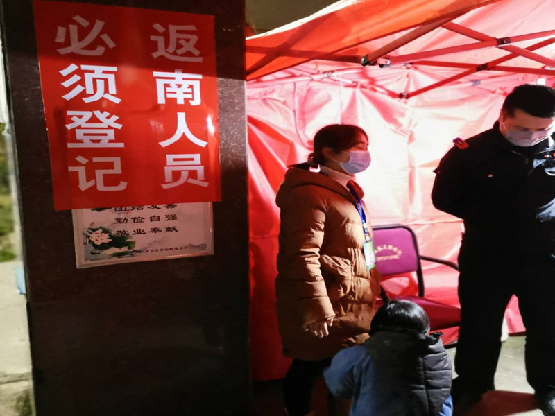 ? 南县青树嘴镇纪检专干黄红与丈夫是同事,年前刚完成婚礼,新婚燕尔,小俩口在前往黄红父母家拜年的高速上,接到了“全员返岗”命令,他们毫不犹豫地掉头,取消婚假,立即回到工作岗位,全身心投入到疫情阻击战。图为夫妻俩在当地民兵广场为群众检测体温,宣传疫情防控知识。