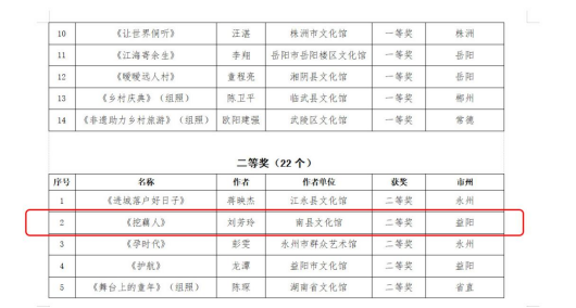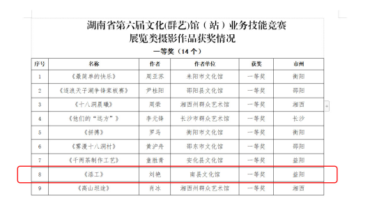近日,由湖南省文化和旅游厅主办的湖南省第六届文化(群艺)馆(站)业务技能竞赛结果揭晓,南县文化馆喜获一等奖1个,二等奖2个,三等奖1个的好成绩,在县文化馆历年赛事上勇创新高。 湖南省第六届文化(群艺)馆(站)业务技能竞赛,是我省举办的规格最高、覆盖范围最广、参与人数最多的一项专门面向省内文化馆站业务人员开展的专业技能竞赛活动,活动包含舞台艺术、群文活动策划、群文辅导、展览艺术、理论调研5大类。 本次比赛的县文旅广体局党组的大力支持下,县文化馆干部职工,认真备战,积极参与,刘艳的摄影作品《漆工》获摄影类一等奖;张美莲、蒋学军《浅析国家级非物质文化遗产——南县地花鼓保护与传承的困境和出路》获调研报告类二等奖;刘芳玲的摄影作品《挖藕人》获摄影类二等奖;周健的书法作品《陆游诗一首》获书法类三等奖。接下来,南县文化馆将以此为契机,再接再励,进一步促进文化馆干部职工专业能力的提升,争取在日后的竞赛中再创佳绩。