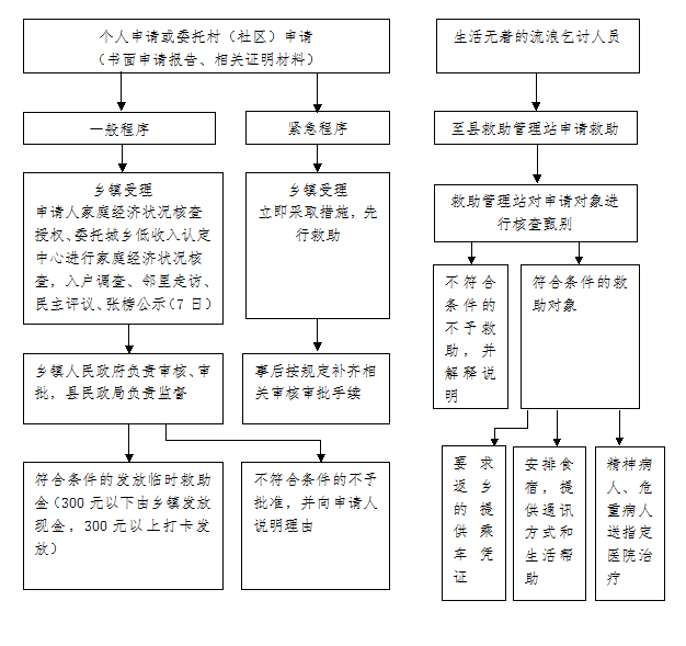 困难居民临时救助资金给付;临时救助对象认定 基本编码(000511002000、000711012000) 一、申请程序 1、一般程序 (一)申请受理。个人申请或委托村(社区)申请,提供居民身份证、户口簿(户籍证明);突发事件的相关材料;县(区)民政部门规定的其他证明材料。 (三)乡镇人民政府负责审核、审批,县民政局负责监督。 (四)符合条件的发入临时救助金(300元以下由乡镇发入现金,300元以上打卡发放) 2、紧急程序 对于紧急情况,应先救助,后补齐手续,确保其基本生活,对不符合条件的不予批准,并向说明理由。 二、申请流程 |