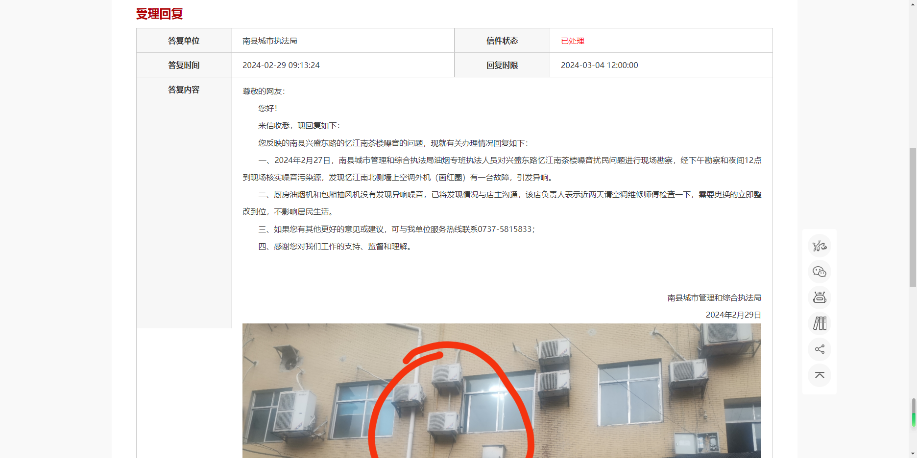 我局执法人员于2024年6月3日下午3时20分前往现场勘察。经核实,该处空调外机因螺丝松动,造成震动噪音扰民,我局执法人员已告知其负责人,已责令进行整改。该负责人表示会及时对空调外机进行整改,后期我局会督促其整改到位,避免影响周围居民。感谢您对我们工作的支持、监督和理解。如果您有其他更好的意见或建议,可与我单位服务热线联系0737-5815833